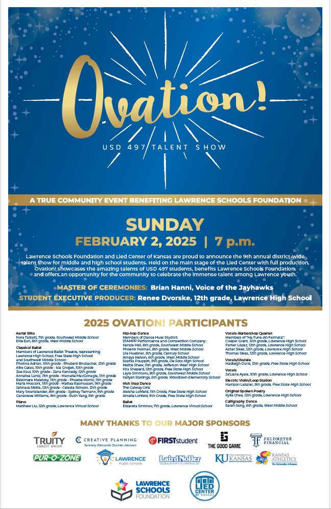 The Lawrence Schools Foundation and Lied Center of Kansas are proud to announce the 10th annual, district-wide talent show for middle and high school students on Sunday, February 1, 2026, at 7 p.m. Past events have included dancers, contortionists, trapeze artists, instrumentalists, singers and more. Students participating in Ovation! will be selected through an audition process, and will share their amazing talents on the main stage of the Lied Center with full production.